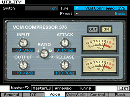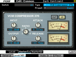 Cet effet simule les caractéristiques des compresseurs analogiques, utilisés comme un effet standard dans les studios d'enregistrement.