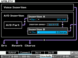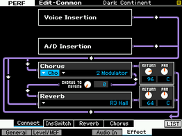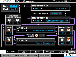 Chacun de ses deux effets peut s'appliquer à l'ensemble des éléments/key qui composent une voice standard sans pouvoir définir un réglage de send spécifique par element. Par contre, chaque élément ou key qui compose une voice peut être routé vers l'un ou l'autre des effets d'insertion ou ne pas passer à travers.