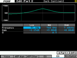 En mode multitimbral, pour chaque part d'une performance, song ou pattern, vous disposez d'un équaliseur 3 bandes.