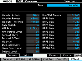 Vous pouvez activer le vocoder sur n'importe qu'elle voice de votre choix en mode voice, en active l'InsL en lieu et place des deux effets d'insertion, effectuer des réglages spécifiques et sauver le tout en tant qu'user voice.