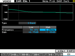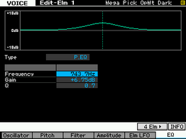 Eq L/H qui est un équaliseur 2 bandes, un P.Eq qui permet de régler la résonance et le gain sur une fréquence donnée, le choix entre les boost 6/12/18 qui permettent respectivement de "booster" un élément/key d'une voice de +6, +12 ou +18 dB.