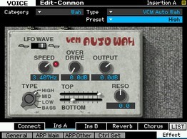 Les effets VCM, Virtual Circuitry Modeling, simulent le comportement des compresseurs, égaliseurs et flanger, phasers, pédale wah vintage.