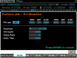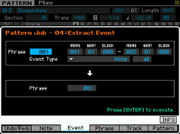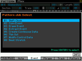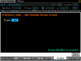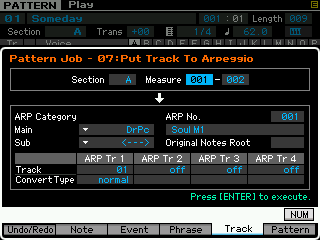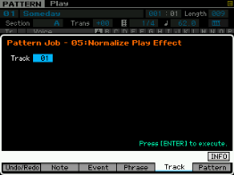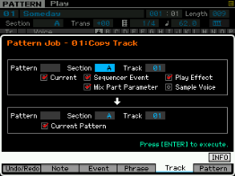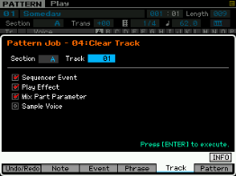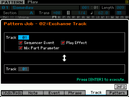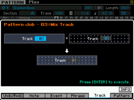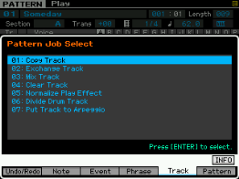 Pour les pistes (track), vous pouvez copier une piste vers une autre piste de la pattern ou vers une autre pattern, échanger des données entre deux pistes, mixer des données entre deux pistes, effacer une piste, effectuer des effets de normalisation, séparer en plusieurs pistes les données d'une piste de batterie, créer des arpèges à partir d'une piste ou des données sont enregistrées et copier les phrases d'une pattern.
