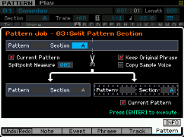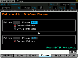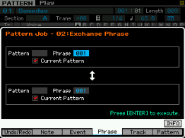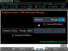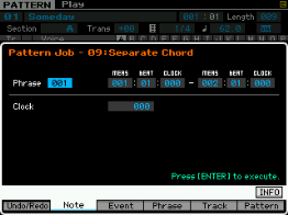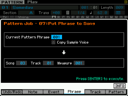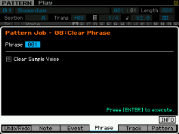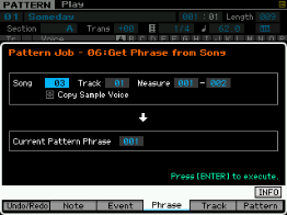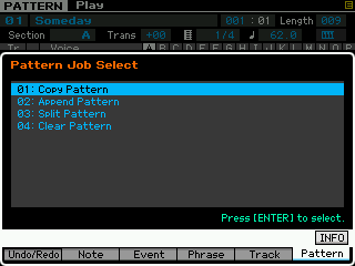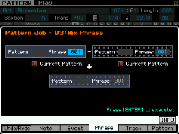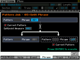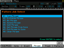 Ici on peut copier une phrase, échanger le contenu de deux phrases, mixer deux phrase, coller deux phrases, découper une phrase, prendre une partie d'une song pour en faire une phrase en pattern, transformer une phrase en arpège, effacer une phrase.